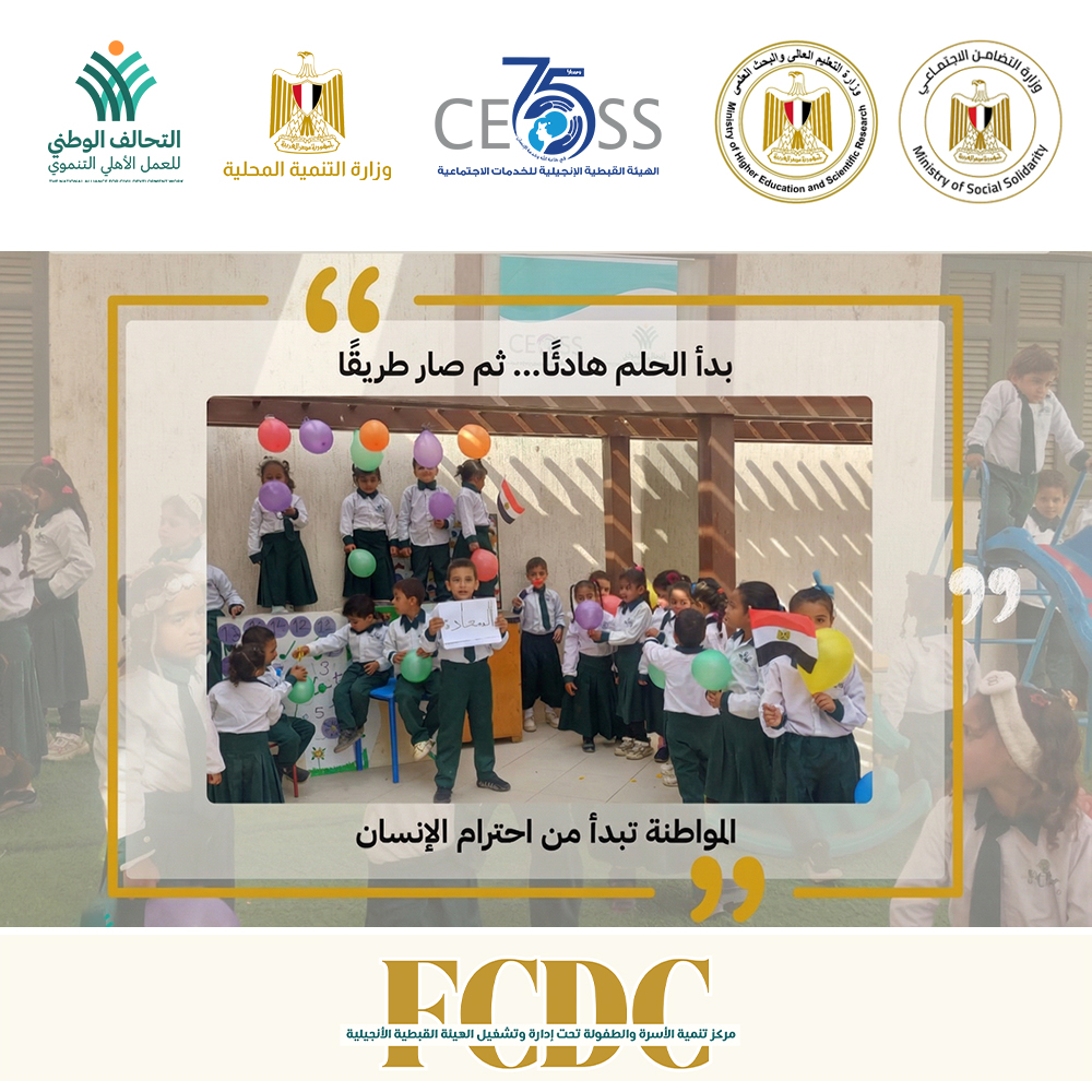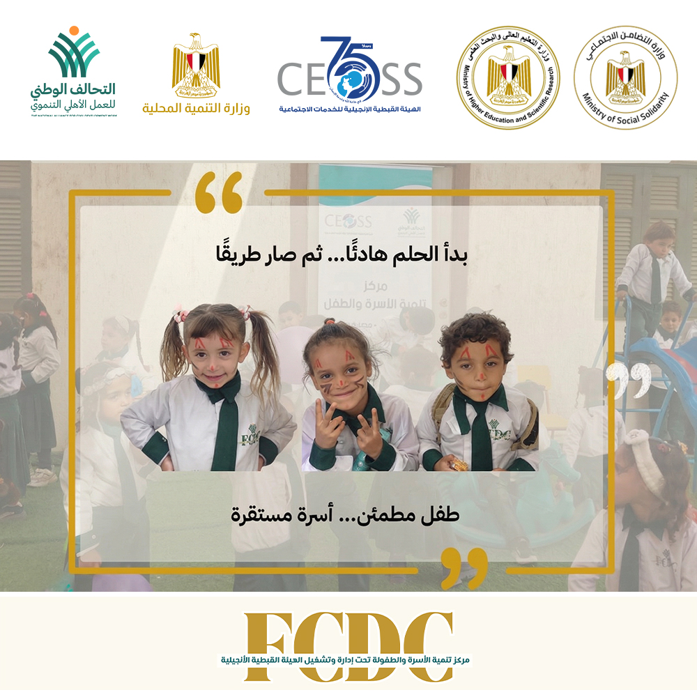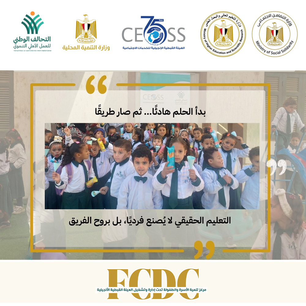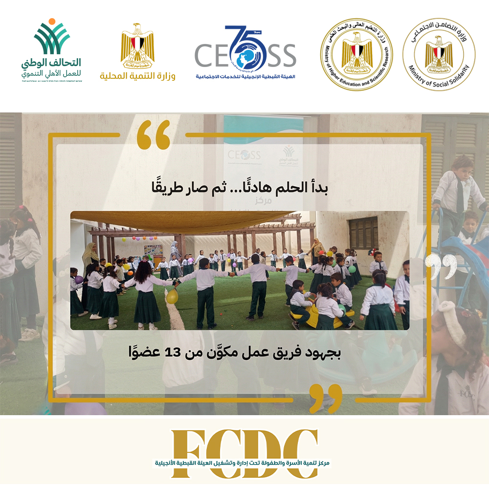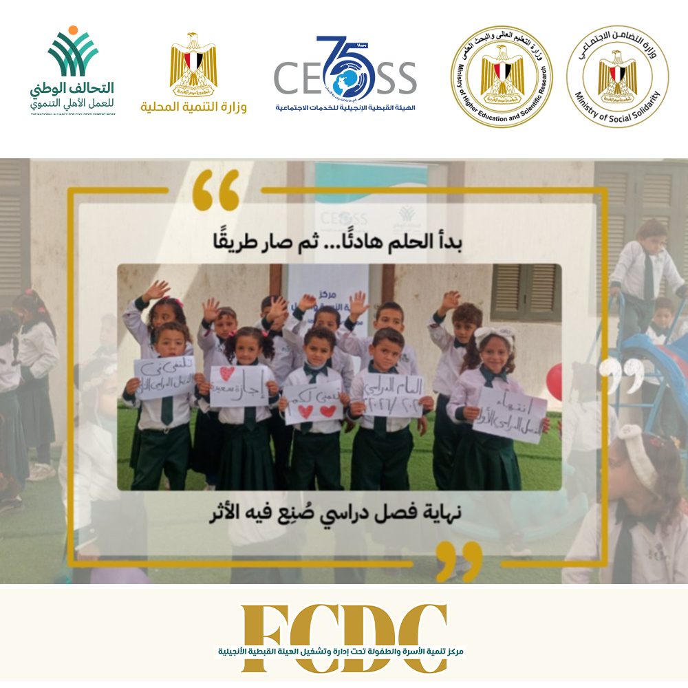 أقامت الهيئة القبطية الانجيلية للخدمات الاجتماعية، عضو التحالف الوطني للعمل الأهلي التنموي، وفي ضوء بروتوكول تشغيل عدد (47) مركز تنمية أسرة وطفل، الموقَّع بين وزارة التضامن الاجتماعي، ووزارة التربية والتعليم، ووزارة التنمية المحلية، والتحالف الوطني للعمل الأهلي التنموي، احتفالًا بختام الفصل الدراسي الأول، نحتفي بـ ١٣٤ طفلًا وطفلة داخل ٢ مراكز تنمية أسرة وطفل، بمحافظات سوهاج والبحيرة، وبأسرٍ آمنت بأن التربية رحلة، وأن النمو لا يكتمل إلا في بيئة آمنة وداعمة.
